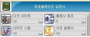샤프 슬래시 1 - 프래시 점프 5 - 사이드 스텝 10 - 샤프 슬래시 10 - 다크 사이트 10