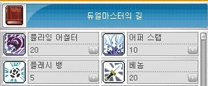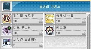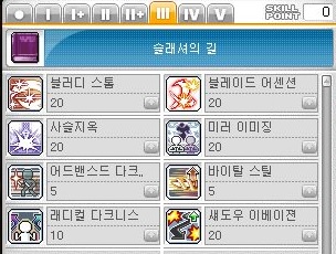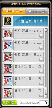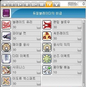 블레이드 퓨리 1 - 써든레이드 1 - 팬텀 블로우 1 -1 파이널 컷 30 - 샤프니스 10 - 이도류 엑스퍼트 30 - 쏜즈 이펙트 20 - 페이탈 베놈 10 - 메이플 용사 30 - 블레이드 퓨리 30 - 써든레이드 30 - 팬텀블로우 30 - 더미 이펙트 30 - 용사의 의지 5