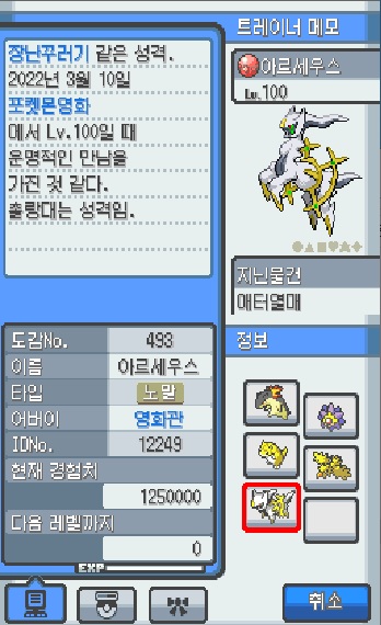 (엔트리에 방금 이벤트를 진행했던 아르세우스를 제외한 다른 포켓몬이 있으면 안됩니다.)