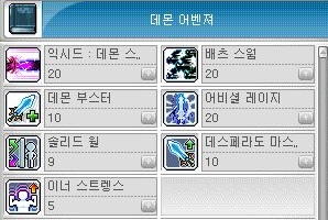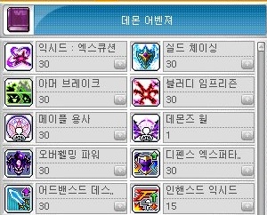 실드 체이싱 1 - 익시드 : 엑스큐션 1 - 디펜스 엑스퍼타이즈 30 - 어드밴스드 데스페라도 마스터리 30 - 오버웰밍 파워 30 - 실드 체이싱 30 - 인핸스드 익시드 15 - 익시드 : 엑스큐션 30 - 메이플 용사 30 - 아머 브레이크 30 - 블러디 임프리즌 30 - 데몬즈 윌 1