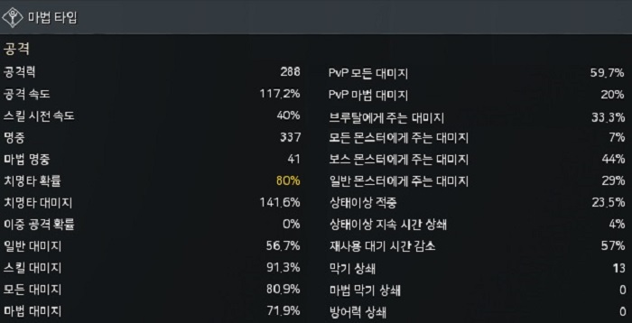 모든 데미지, 직업 데미지가 합적용이다보니 스킬 데미지, 치명타 데미지의 효율이 좋습니다.
