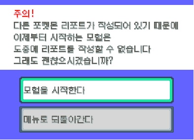 새로운 모험 시작 후 "이미 다른 포켓몬 리포트가 작성되어 있으므로 리포트를 작성할 수 없습니다." 문구가 뜨며 저장이 되지 않아 방법을 찾다 방법을 알아내 포스팅을 작성하게 되었습니다.