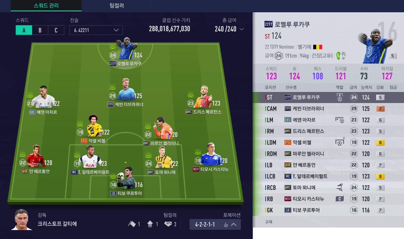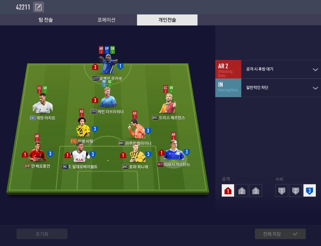 4222를 사용하고 싶었지만 벨기에는 톱 자원이 부족해 42211 포메이션을 사용중입니다.