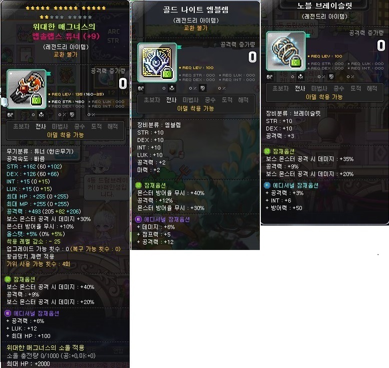 17성 레전드리 앱솔랩스 무기, 레전드리 3줄 보조무기, 유니크 이상 엠블렘