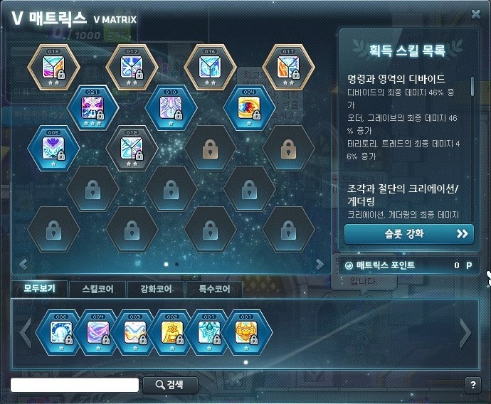 주력기 코어는 50레벨 이상, 5차 스킬 코어도 1개정도는 마스터에 가깝게 찍어주셔야 합니다.