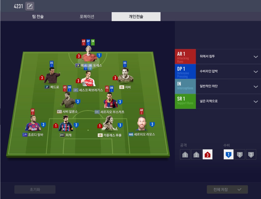 다비드 비야와 이니에스타가 피파온라인 4에 없어 어쩔수 없이 4231 포메이션을 사용 중입니다.