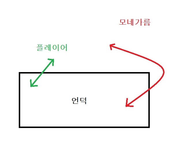 플레이어는 짧은 쪽의 언덕을 넘어가고, 모네가름은 넓은 쪽의 언덕을 넘어가게 해야 합니다.