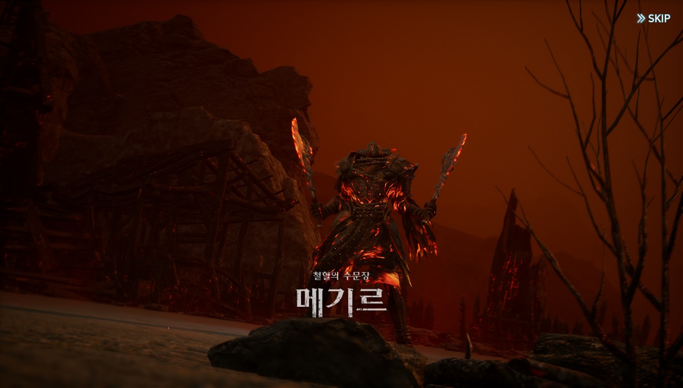 저주 스킬은 메기르가 화염 오라를 몸에서 뿜어냅니다.