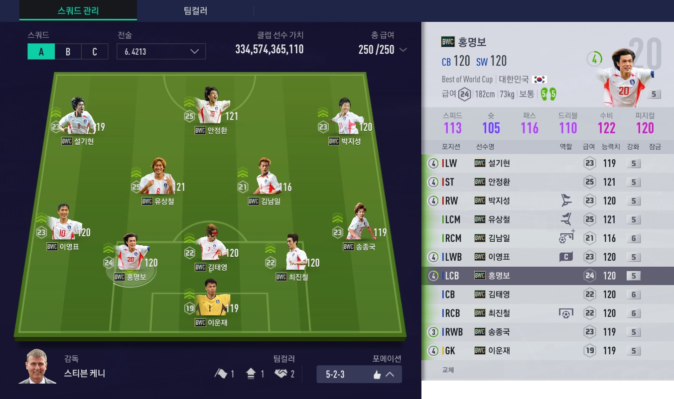 스쿼드메이커로 2002년 대한민국 스쿼드를 구성했는데, 급여가 딱 250이 나오길래 바로 맞춘 팀입니다.