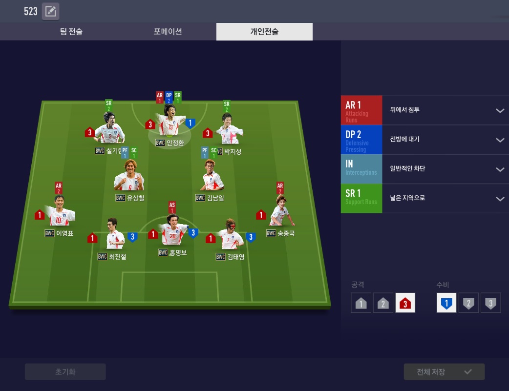 5백 포메이션을 잘 사용하지는 않지만, 2002 대한민국의 감성을 최대한 살리기 위해 523 포메이션을 사용중입니다.