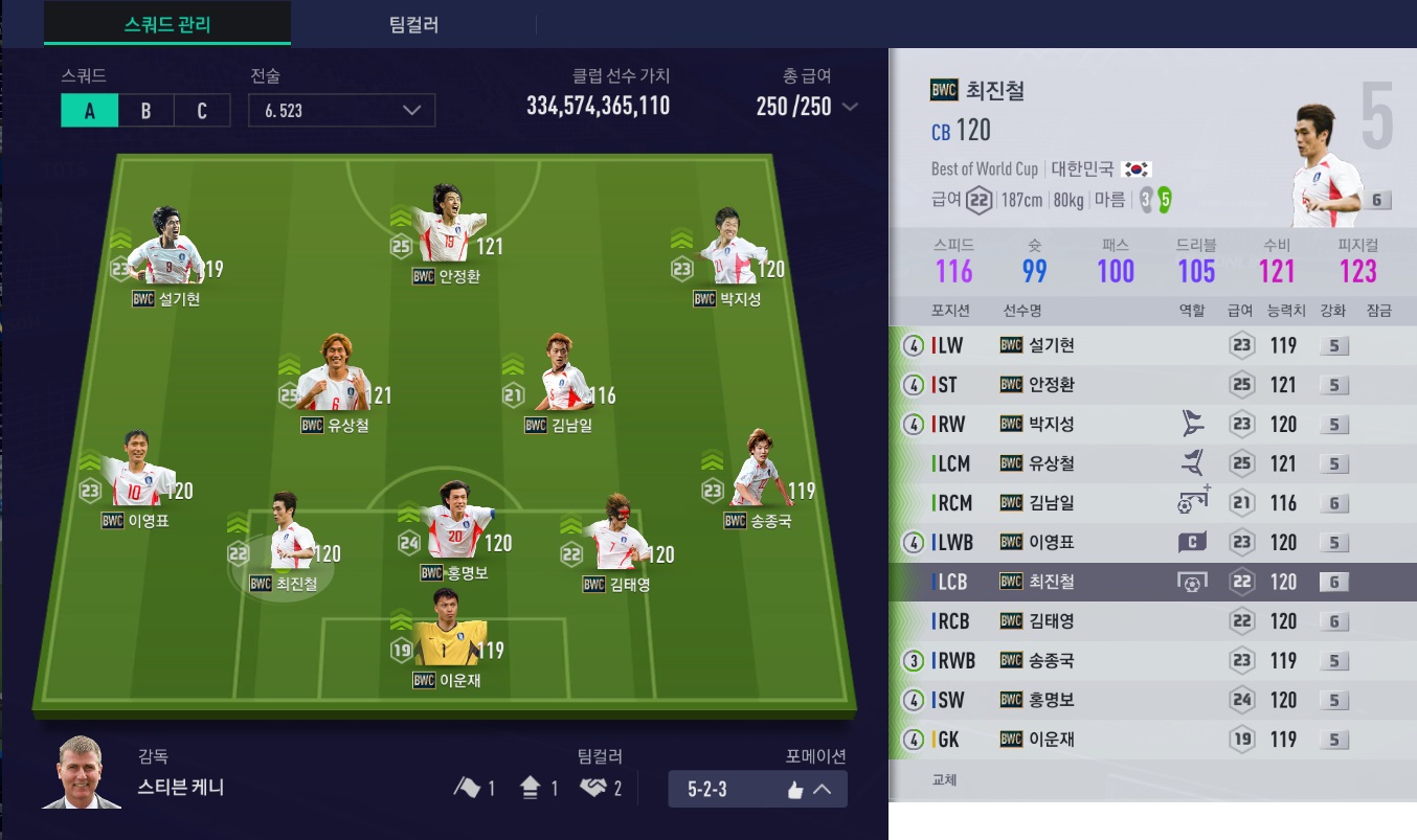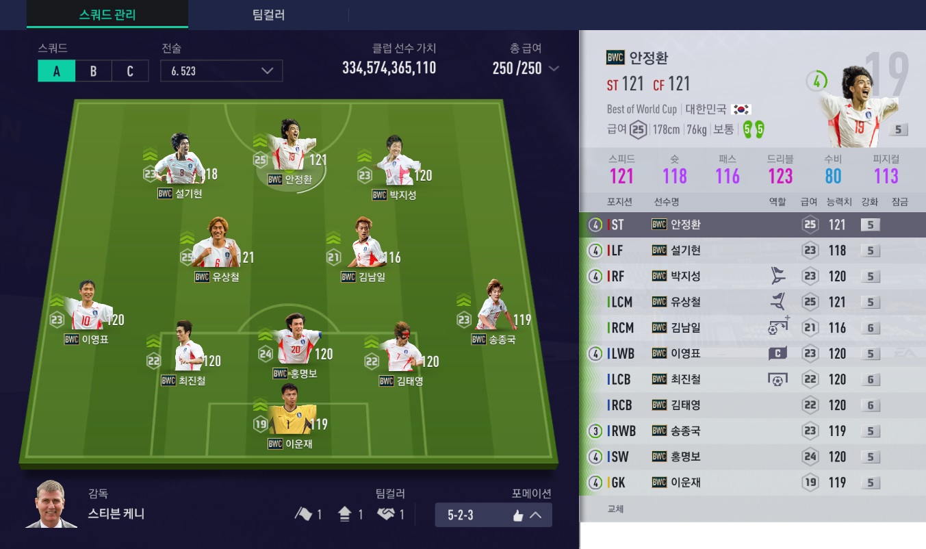 스쿼드메이커로 2002년 대한민국 스쿼드를 구성했는데, 급여가 딱 250이 나오길래 바로 맞춘 팀입니다.