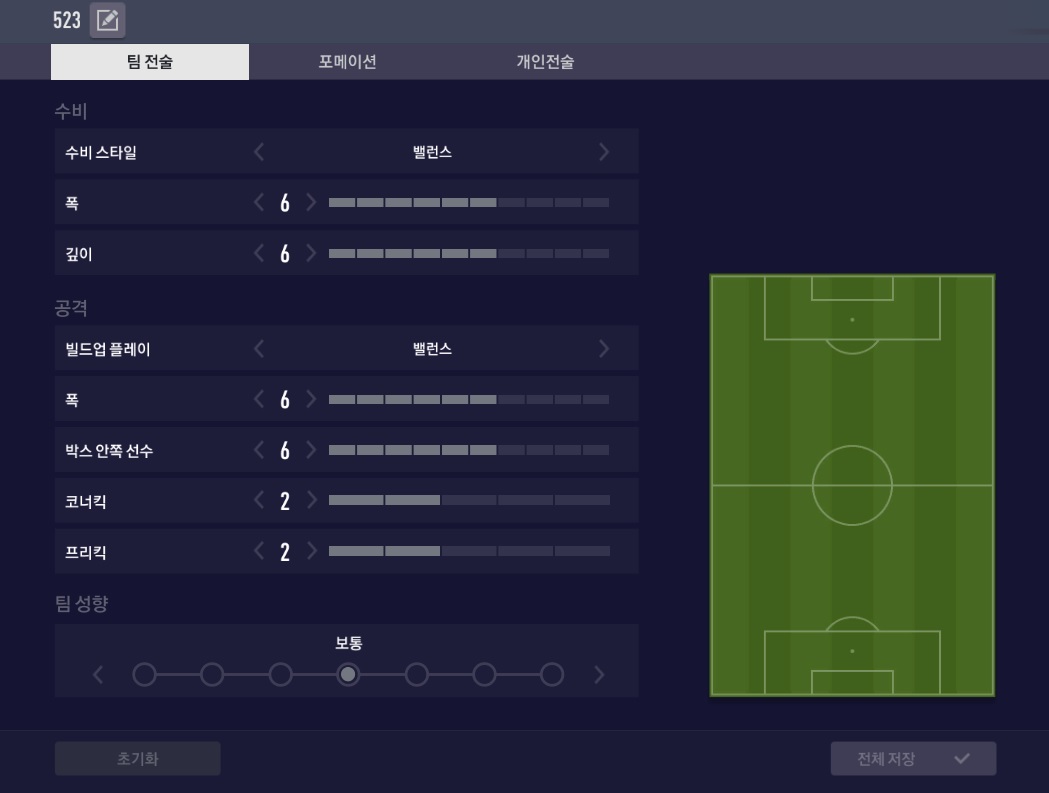 5백 포메이션을 잘 사용하지는 않지만, 2002 대한민국의 감성을 최대한 살리기 위해 523 포메이션을 사용중입니다.