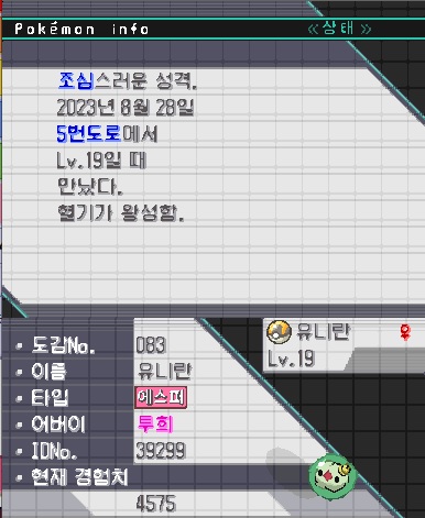 물풍경시티로 가기 전, 위쪽 풀숲에서 유니란을 잡아 주었습니다.