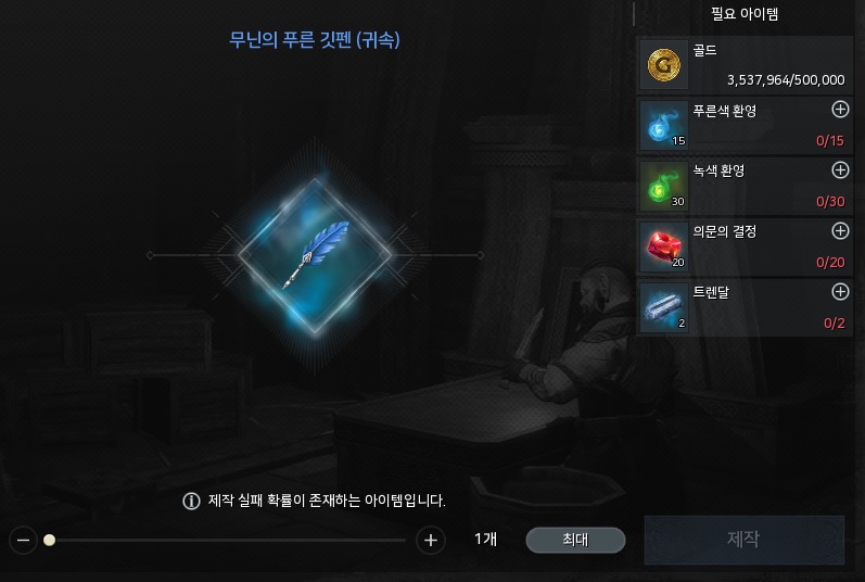 무닌의 푸른 깃펜 제작 성공 확률은 20%입니다.