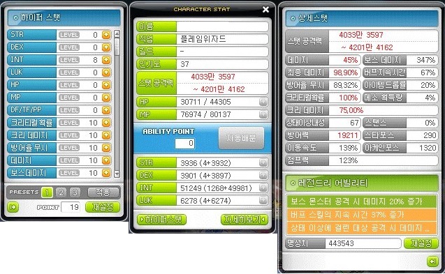 스공 4천만, 보공은 347%이며, 하이퍼스탯은 인트를 8개 찍었습니다.