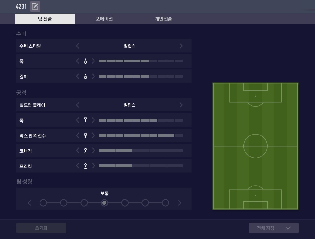 4231 포메이션이 수비가 안정적이라 계속 사용하고 있습니다.