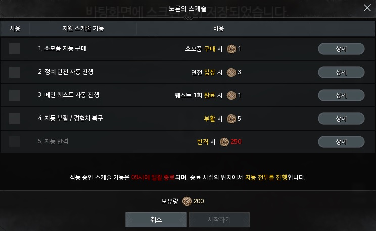 노른의 동전을 사용해 물약 충전, 던전, 퀘스트 자동 진행, 경험치 복구, 자동 반격을 할 수 있습니다.