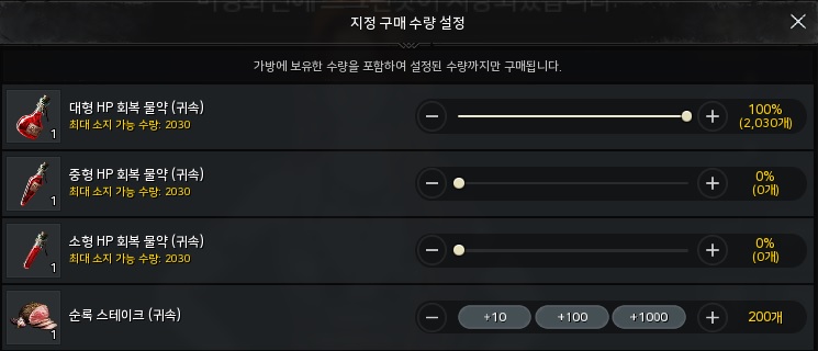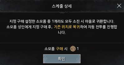 소모품이 0개가 될 시 마을로 자동 복귀해 설정한 개수만큼 아이템 구매 후, 사냥하던 곳으로 돌아온다고 합니다.