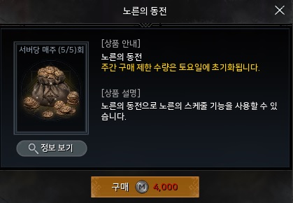 노른의 동전은 캐시샵에서 4000마일리지로 200개를 구매할 수 있습니다.