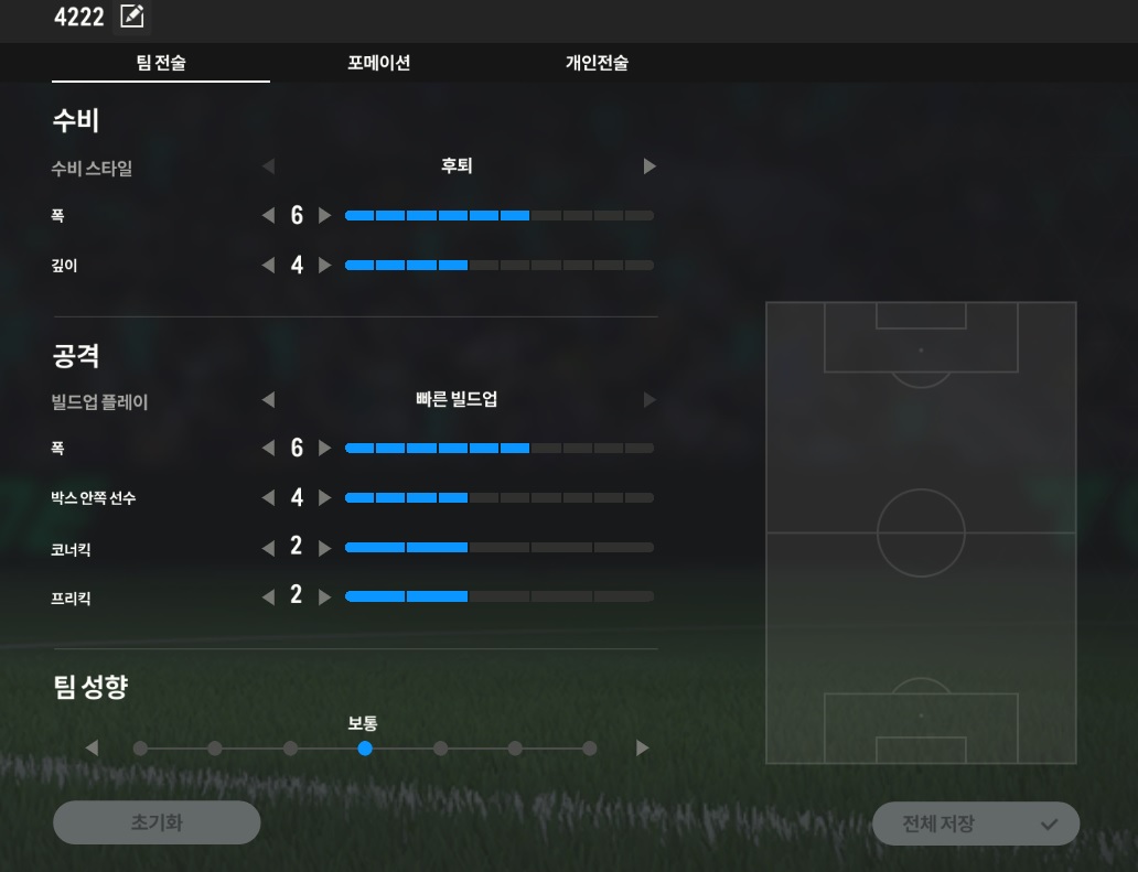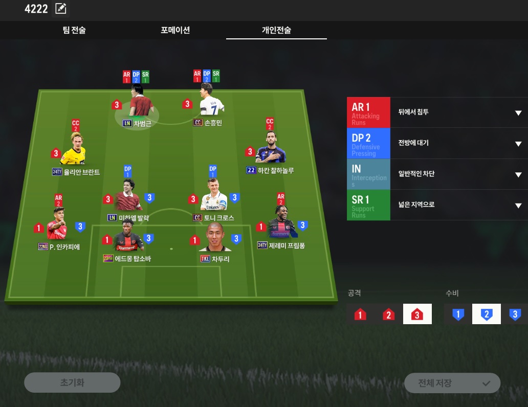 4222 포메이션의 팀전술과 개인전술을 사용하고 있습니다.