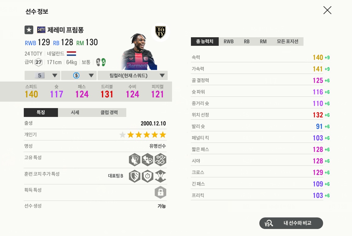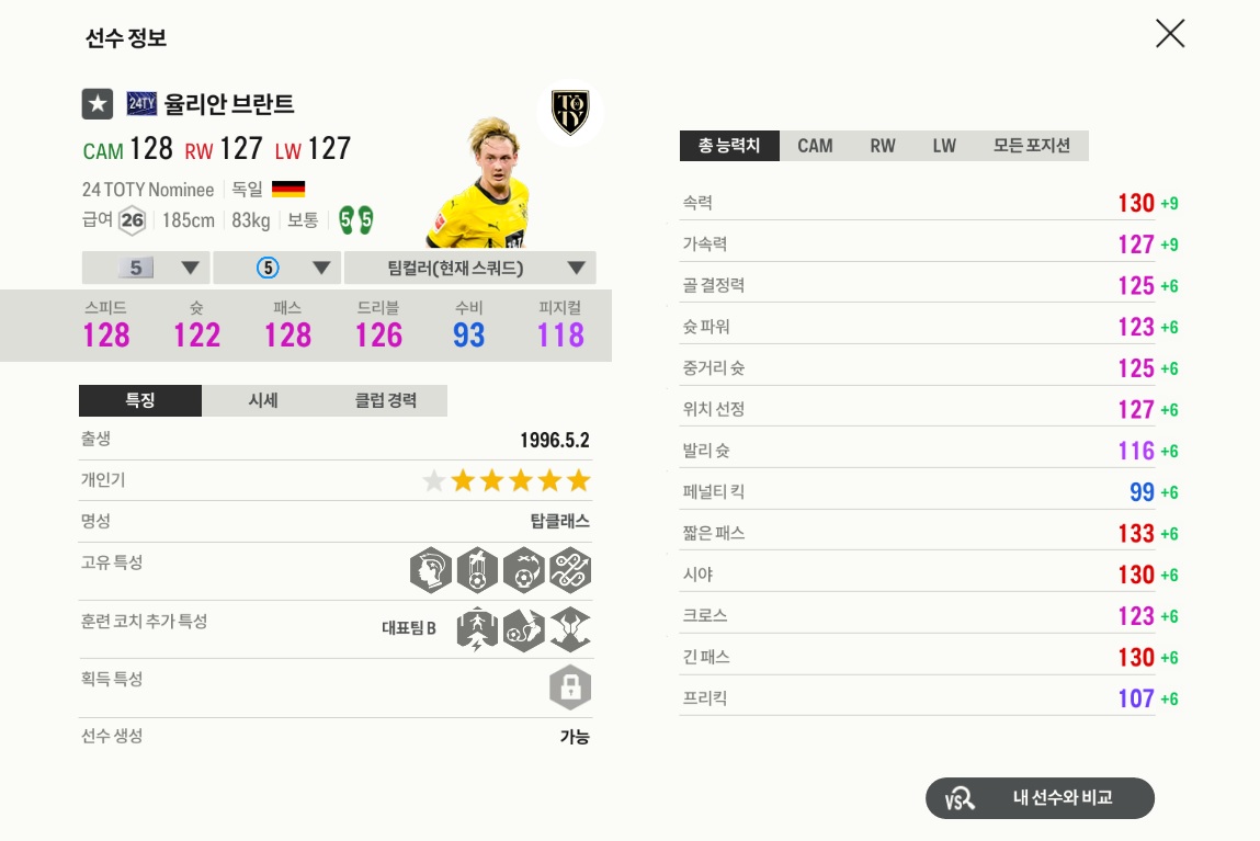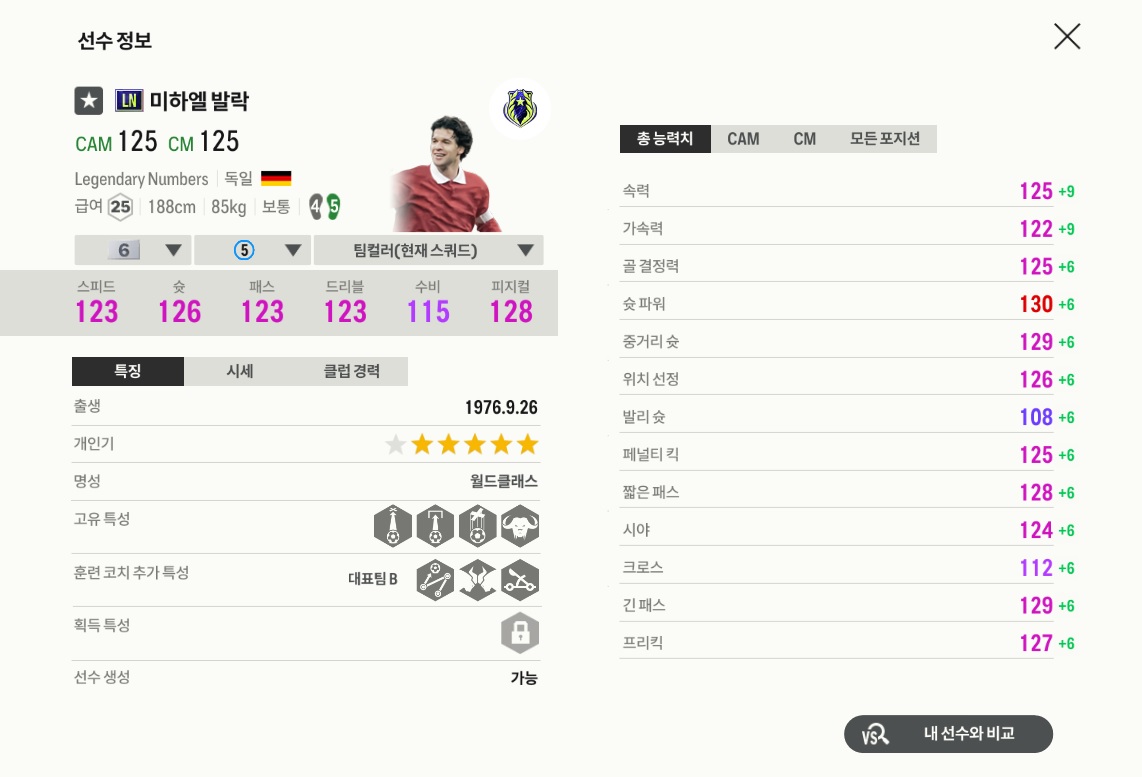 발락의 피지컬에 체감도 좋고, 수비 스탯도 준수합니다.