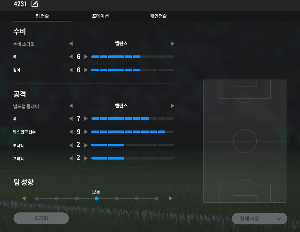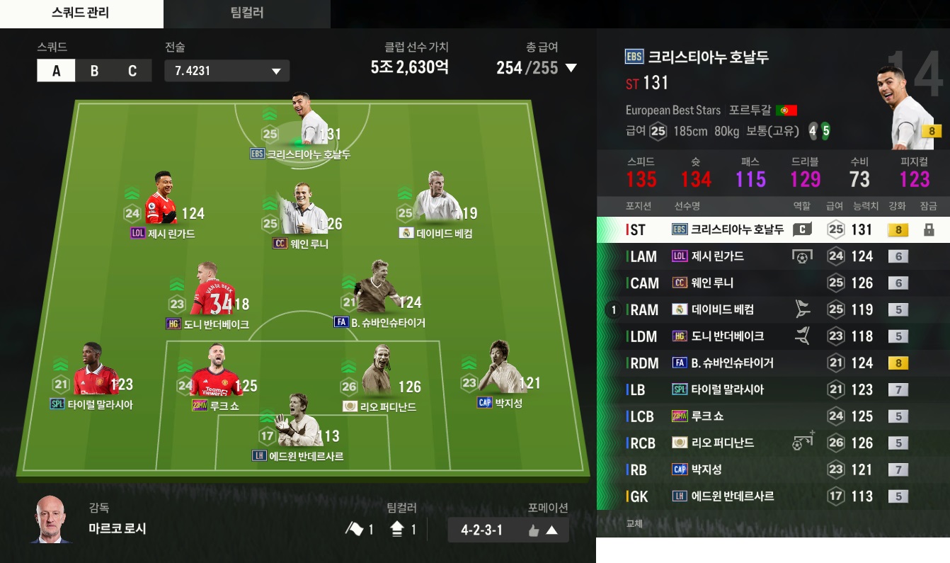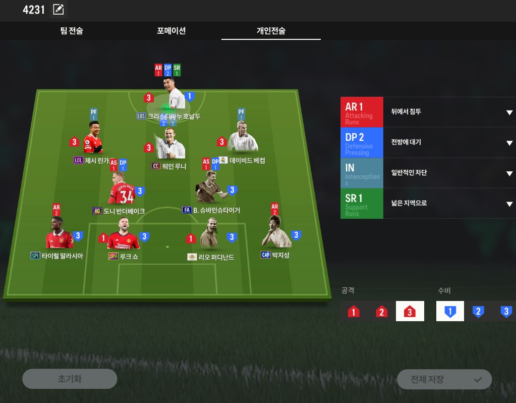 윙이 부실해 4231 포메이션으로 돌아왔습니다.