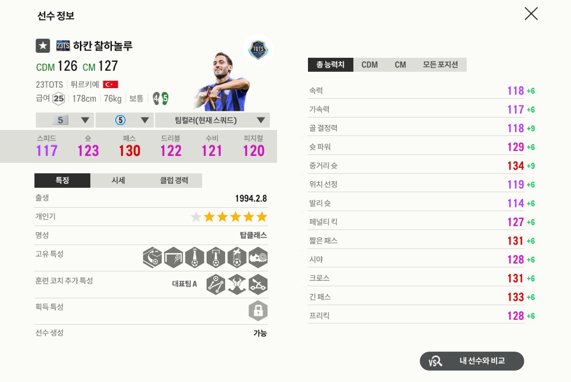 레버쿠젠에서 사용했던 22챔스 찰하놀루가 공미, 윙어용이라면 23TOTS는 수미용 시즌입니다.