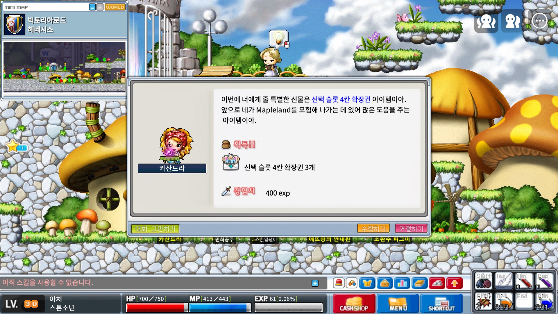 30레벨을 달성하면 카산드라에게 선택 슬롯 확장권을 3개 받을 수 있습니다.