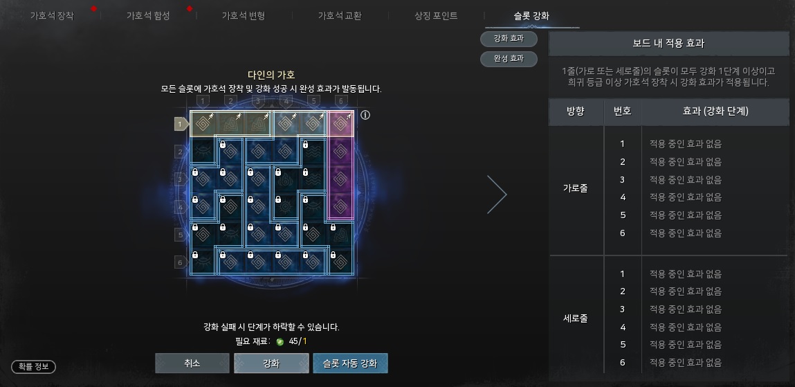 가호석 보드 잠금 해제 후, 가호석 슬롯 강화 창으로 들어가 줍니다.