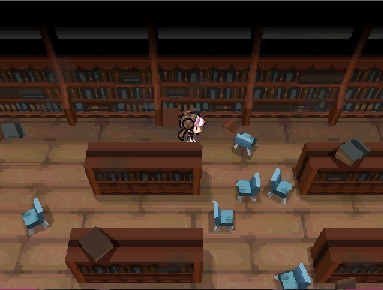 책꽂이 사이를 통과해 우측 하단 계단으로 가 줍니다.