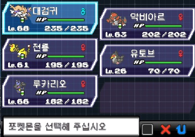 사천왕(연무) : 던지미 lv72, 타격귀 lv72, 루카리오 lv72, 비조도 lv72, 요가렘 lv72, 노보청 lv74