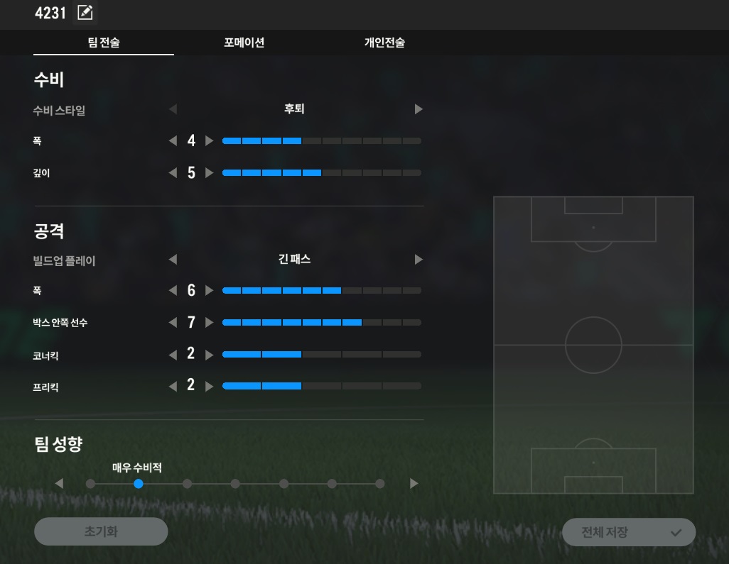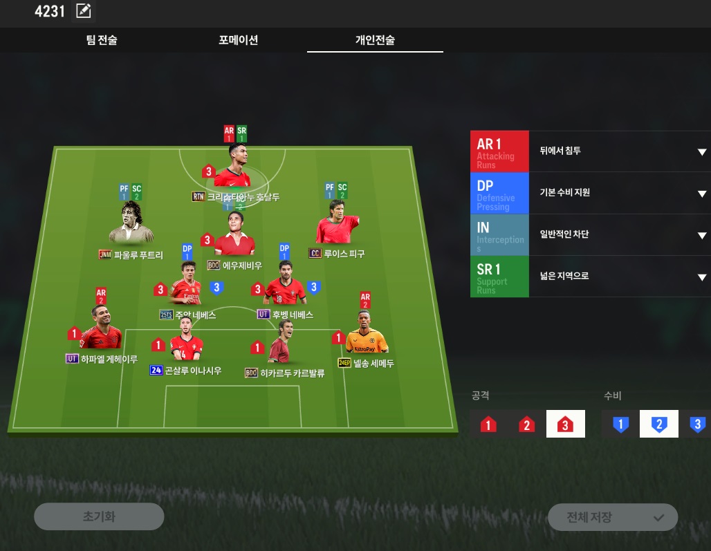 계속 4231 포메이션의 팀전술과 개인전술을 사용중입니다.